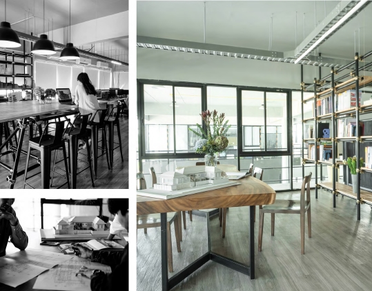 The approach to design is to bring natural material. 'Bamboo' which are characterized in terms of strength, the equivalent of elemental metals. Sticky and high flexibility is a key element in the building Facade and interior parts, by the results of the use of bamboo. In addition to the ability to adapt to the environment better, then such material can also prevent sunlight. By letting the wind blows through them at the same time as a way to circulate the air in a natural way. The team also designed the bare concrete surface materials combined with nudes in combination with industrial genres. Example of floating steel tube in Interior.